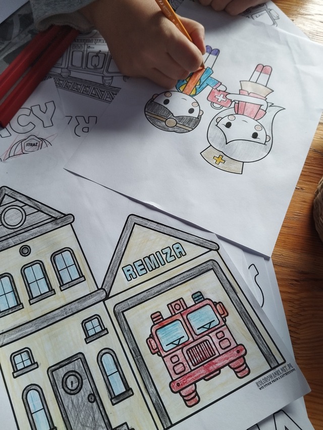 Dzieci chętnie wykonywały papierowe apteczki, a najmłodsi uczestnicy chętnie malowali kredkami i rozmawiali o tym, jak pracują strażacy. Poruszaliśmy różne tematy i opowiadaliśmy, z czym wiąże się praca strażaka.