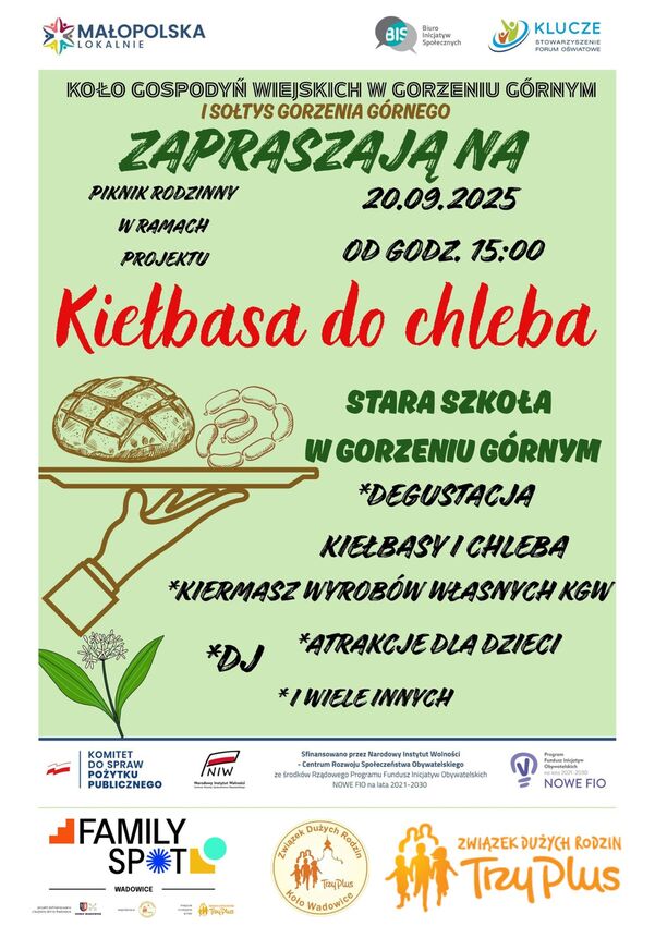 W słoneczną sobotę 20.09.2025r, w ramach projektu #FamilySpotWadowice przeprowadziliśmy kreatywne warsztaty dla rodzin jako wydarzenie towarzyszące podczas PIKNIK RODZINNY W RAMACH PROJEKTU KIEŁBASA DO CHLEBA w Gorzeń Górny